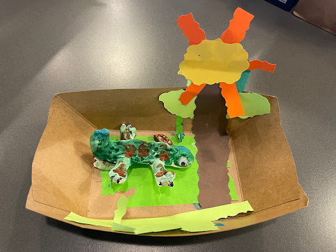 Another sync: this week I was reading in Henry Cabot Lodge’s biography of George Washington and he said “Men are the creatures of the time in which they live, and take their color from the conditions which surround them, as the chameleon their color from the grass or leaves in which it hides.” Bill had posted an art project from his son that featured a chameleon hiding in the grass as Lodge mentioned: